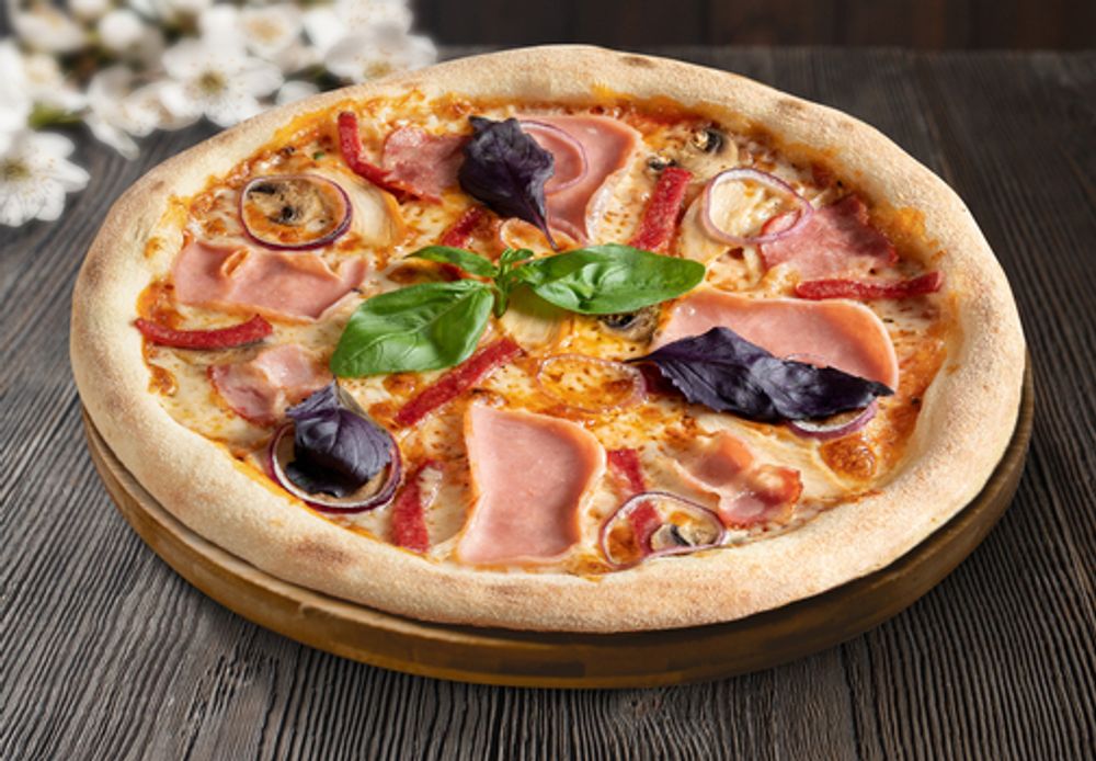 Сыр моцарелла, бекон копченый, ветчина, куриная грудка, пепперони, грибы шампиньоны, лук красный репчатый, зелень, томатный соус, чеснок.
