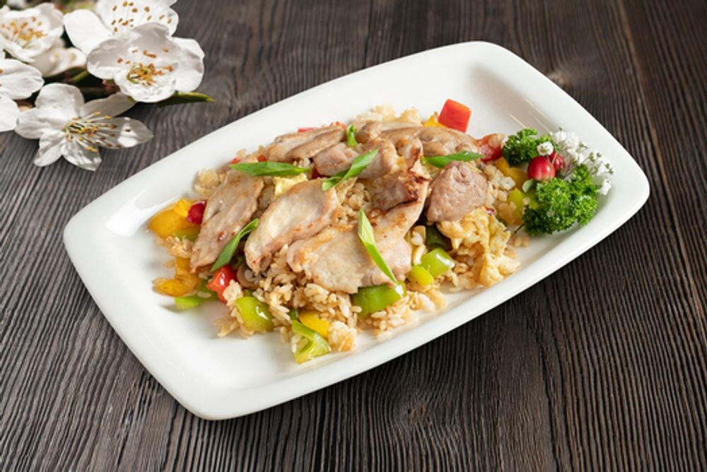 Куриное филе, паприка, репчатый лук, зеленый лук, рис, яйцо, кунжутное масло, чеснок, соевый соус.