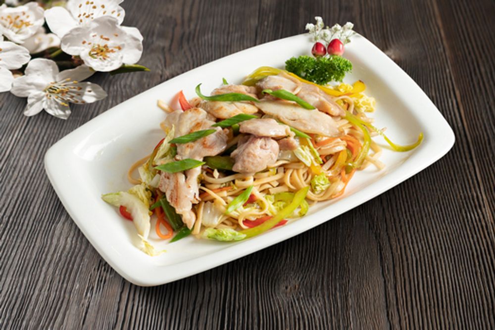 Куриное филе, лапша удон, репчатый лук, паприка, китайская капуста, морковь, чеснок, зеленый лук, соус саппоро.