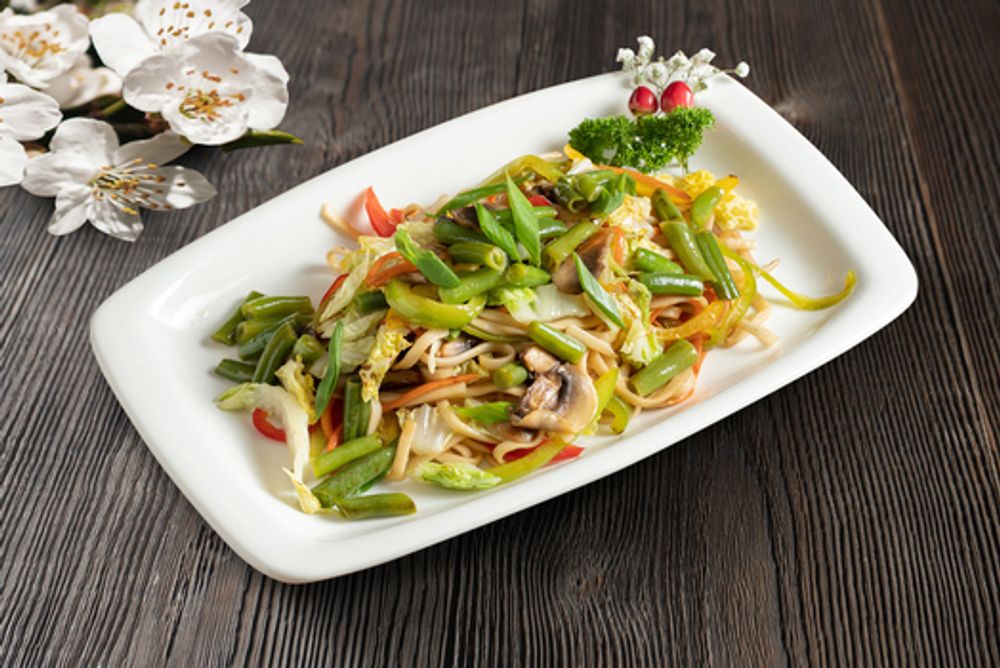 Грибы шампиньоны, стручковая фасоль, лапша удон, репчатый лук, паприка, китайская капуста, морковь, чеснок, зеленый лук, соус саппоро.