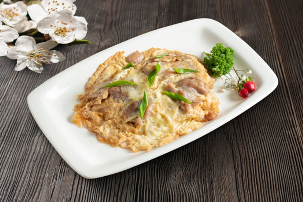 Куриное филе, рис, яйцо, репчатый лук, зеленый лук, соус саппоро, кунжут.