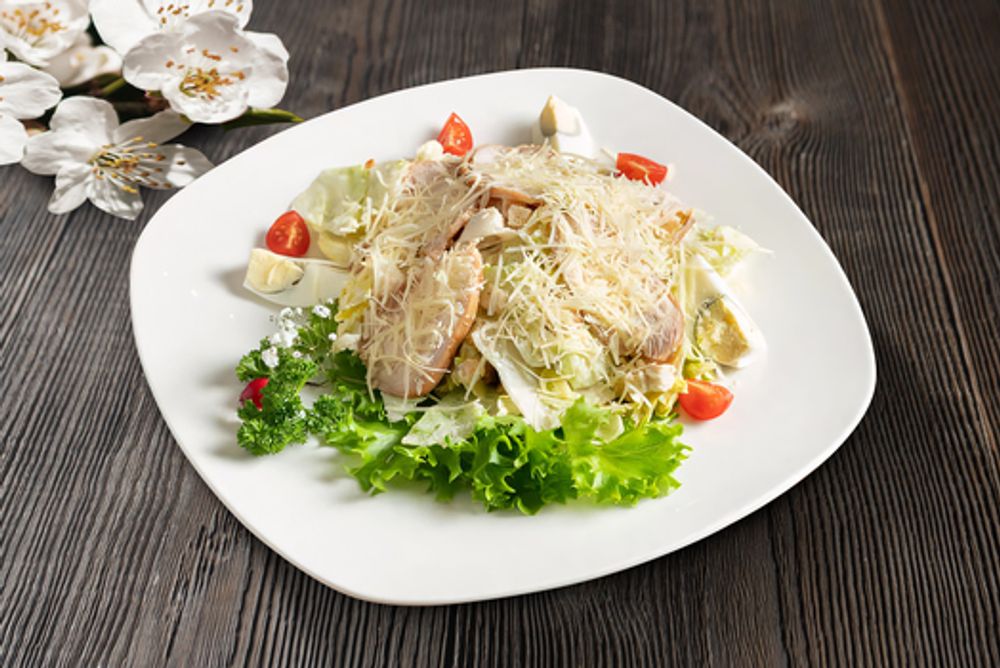 Запеченная куриная грудка, яйцо вареное, салат айсберг, помидоры черри, сыр пармезан, крутоны, соус цезарь.
