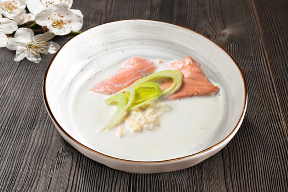 Куриный бульон, лосось, сливки, яйцо, рис, лук порей.