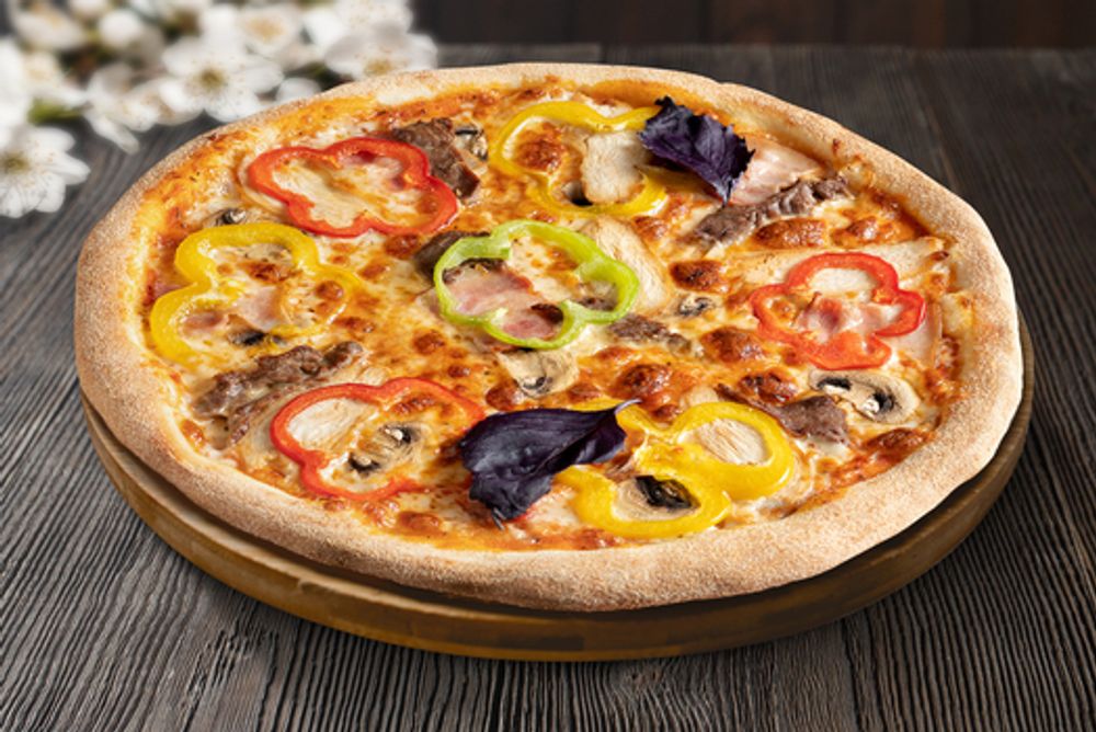 Сыр моцарелла, говяжья вырезка, куриная грудка, бекон копченый, паприка, грибы шампиньоны, помидоры, томатный соус.