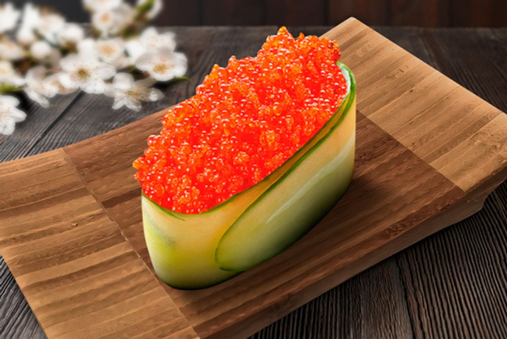 Икра масаго, рис, огурец.