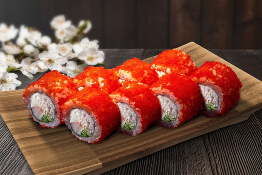 Креветка тигровая, снежный краб, сыр Cremette, огурец, рис, водоросли нори, икра масаго.