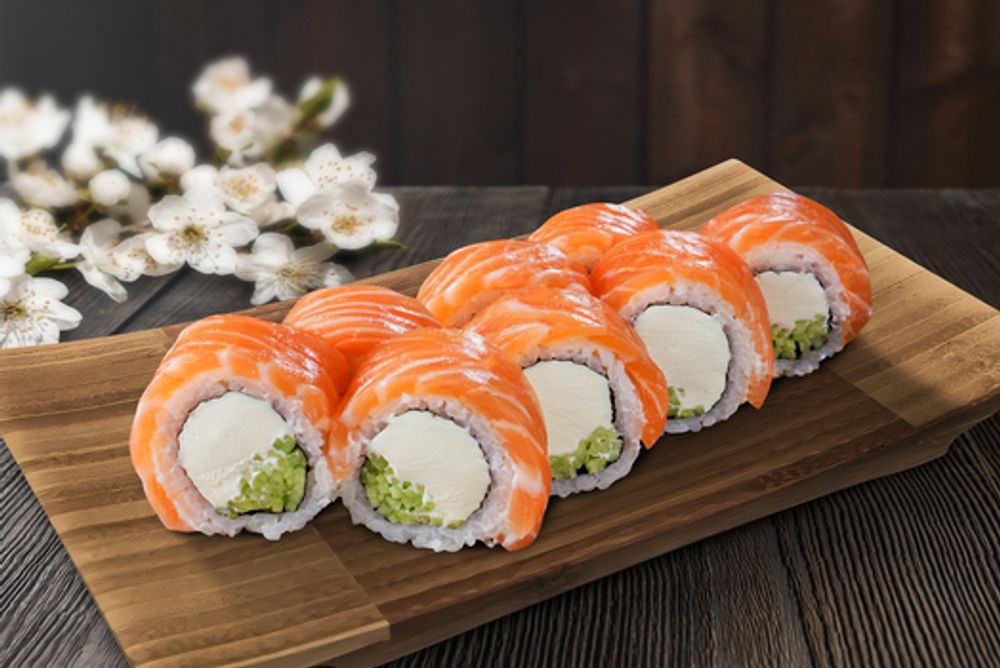 Лосось, сыр Cremette, огурец, рис, водоросли нори.