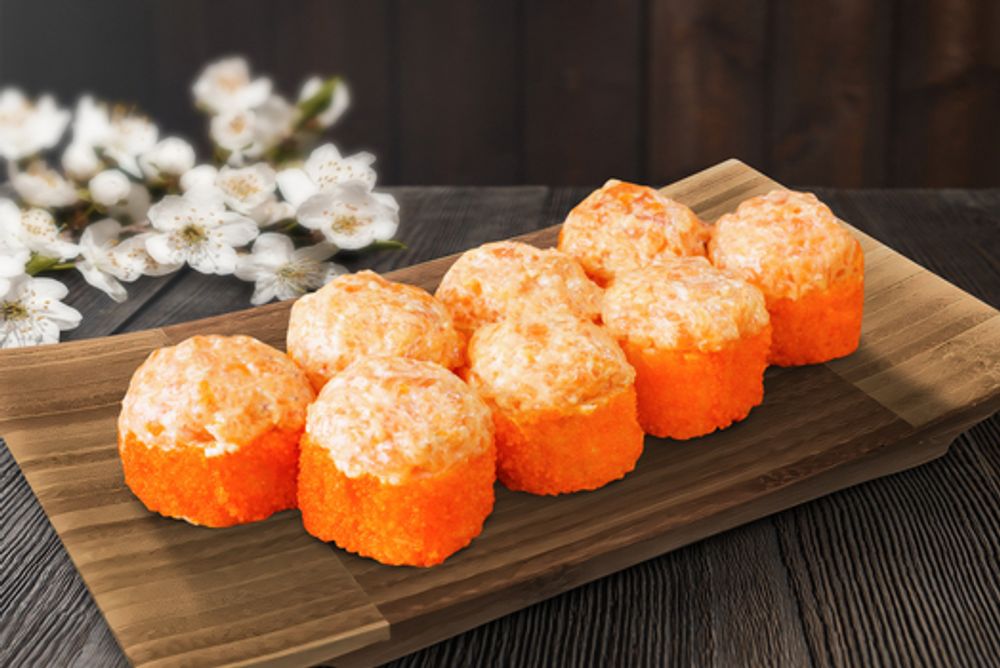 Лосось, огурец, рис, водоросли нори, икра масаго, спайси соус.