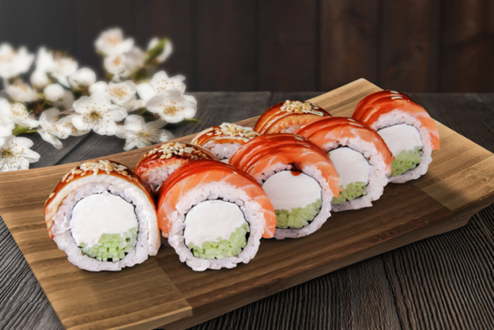 Лосось, угорь, сыр Cremette, огурец, рис, водоросли нори, унаги соус, кунжут.