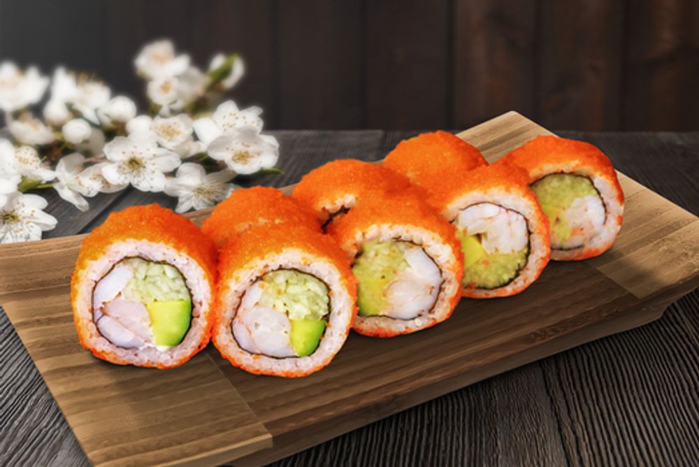 Креветка тигровая, авокадо, огурец, рис, водоросли нори, икра масаго.