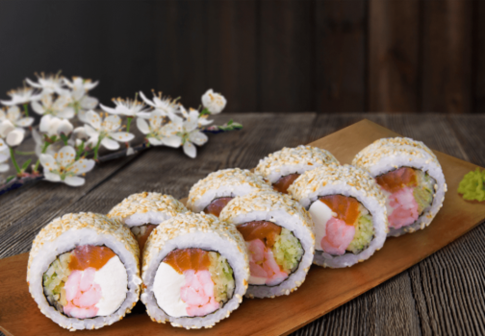 Лосось копченый, креветка тигровая, сыр Cremette, огурец, рис, водоросли нори, кунжут.
