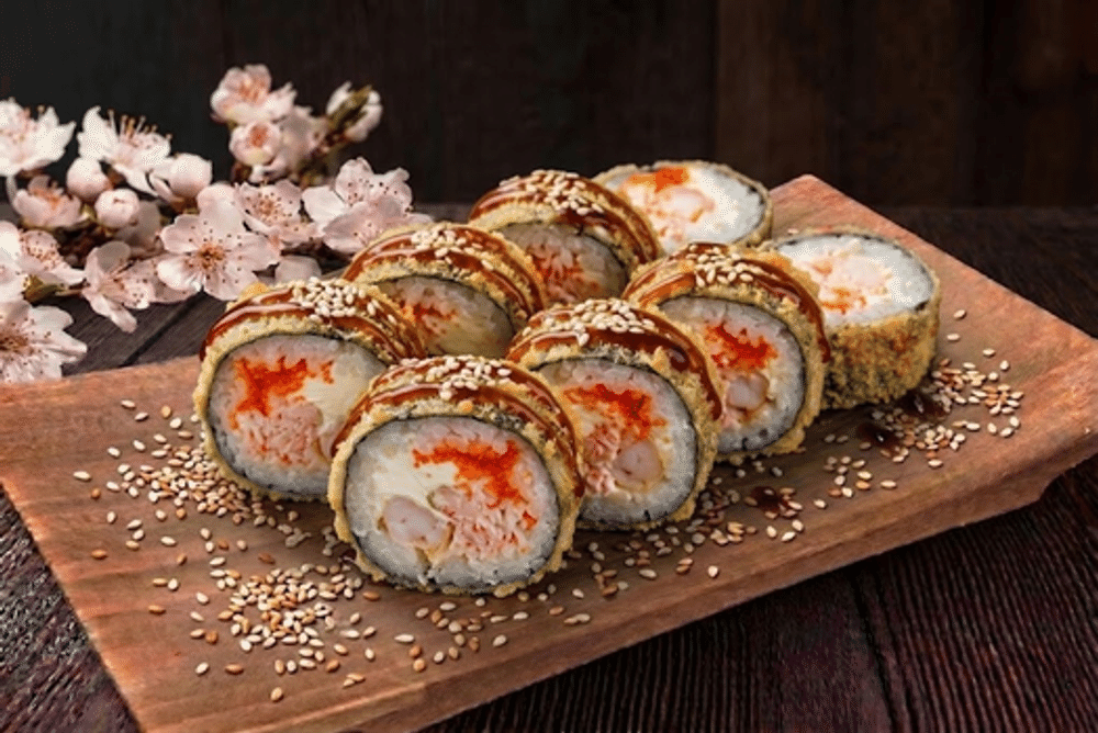 Креветка тигровая, снежный краб, сыр CREMETTE, кляр темпура, рис, водоросли нори, икра масаго, унаги соус, кунжут.